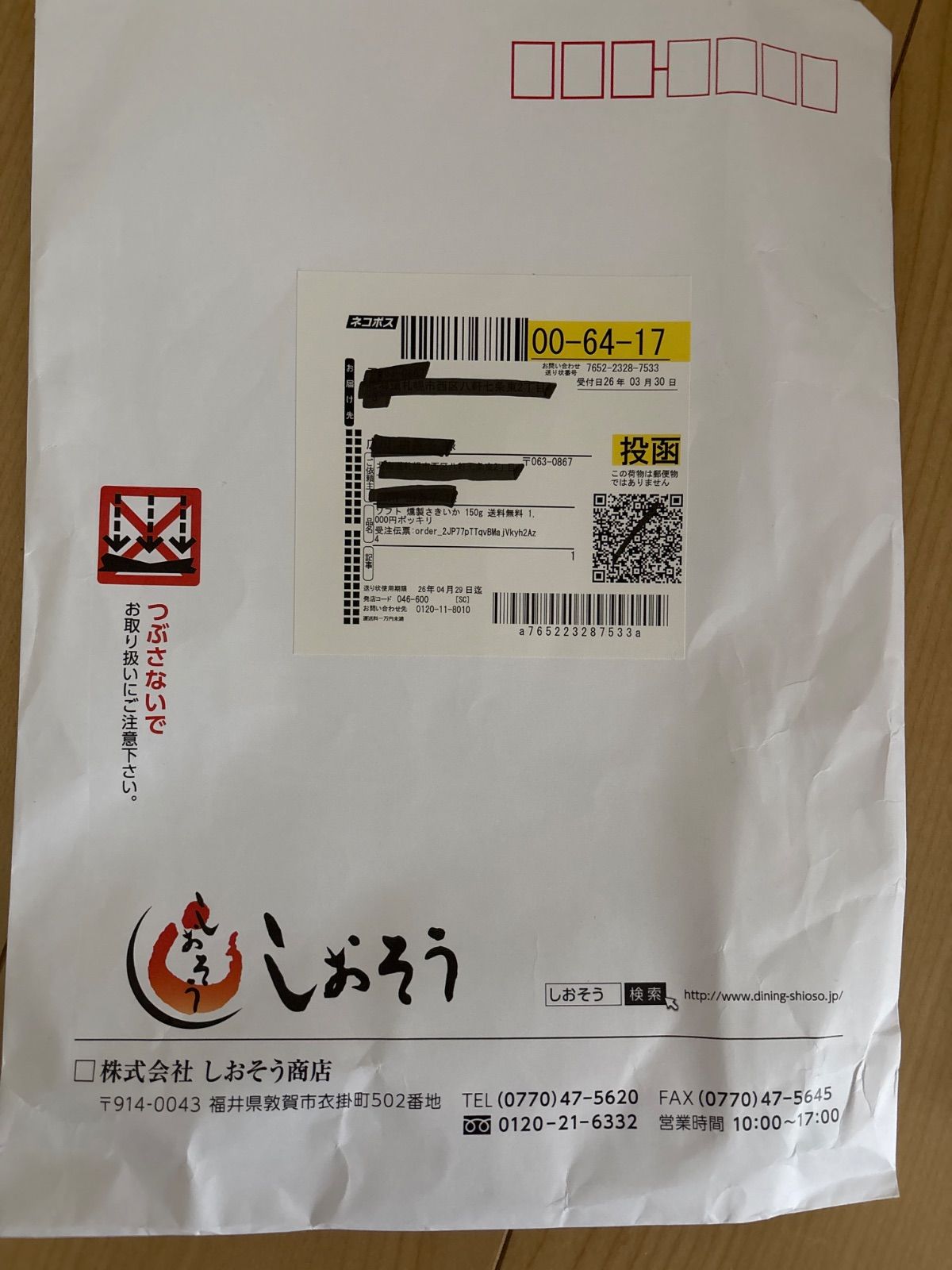 今日、届きました。ありがとうございました。
