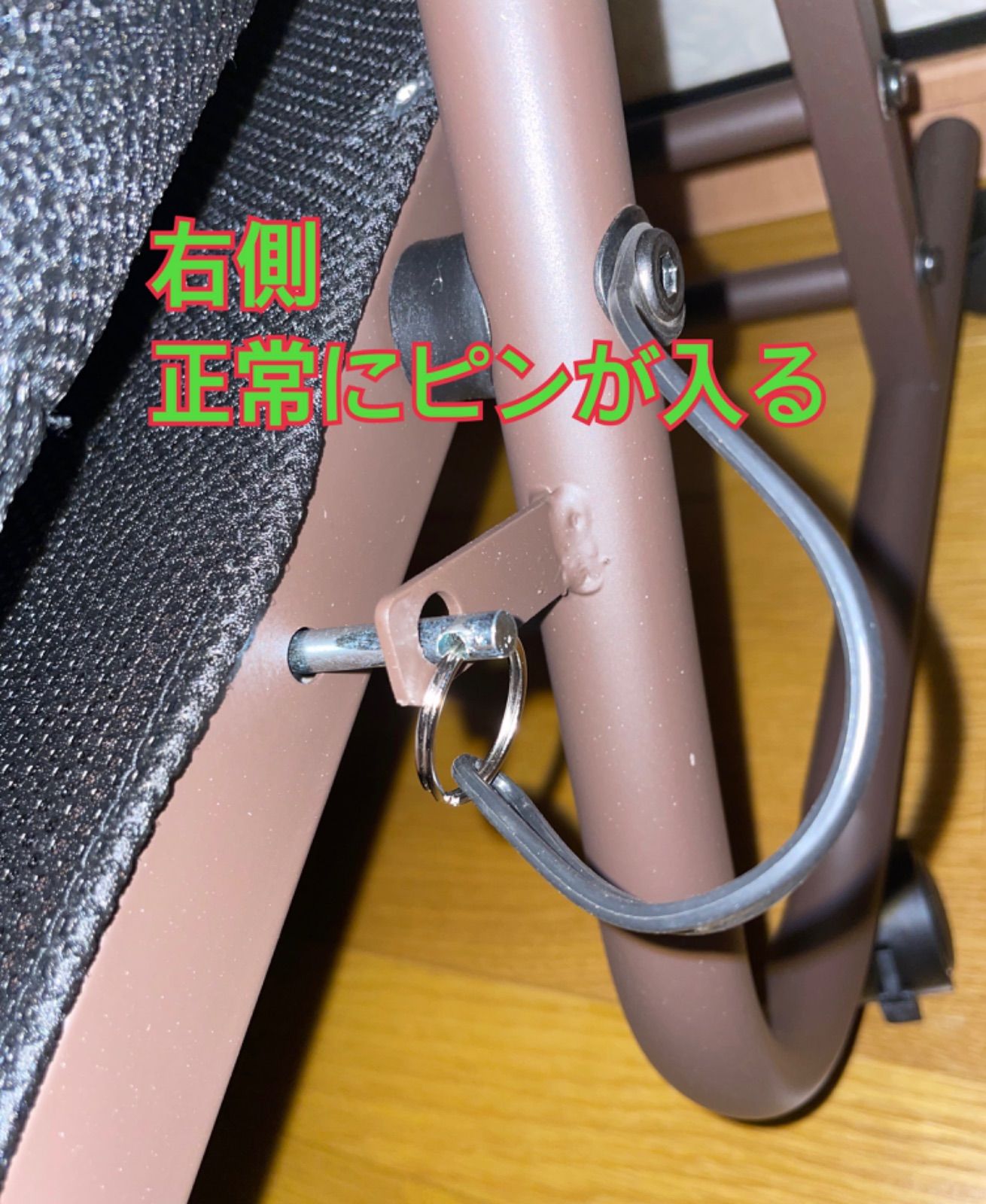 商品に不具合があり大変申し訳ございません。 写真を拝見させて頂くと、本体側の穴位置というのは左右対象の位置に穴が空いていると思います。 (B)脚部(宮側)左のピンを刺す所が歪んで入らないのではないでしょうか? 本体が悪いのか脚部が悪いのかのどちらかかと思いますので 部材交換にて対応させて頂きたいと思います。 一度ご確認頂きまして、部材交換で良ければ検品の上出荷致します。 その際は同時引取交換にて手配致します。 ※お手元の部材はお客様にて再度梱包して頂く必要がございます。 どちらが悪いかお知らせください。 無償交換対応期間は7/10までとなります。 1.本体 2.脚部(宮側)左側 お手数をおかけいたしますが、何卒宜しくお願い致します。 担当:中道