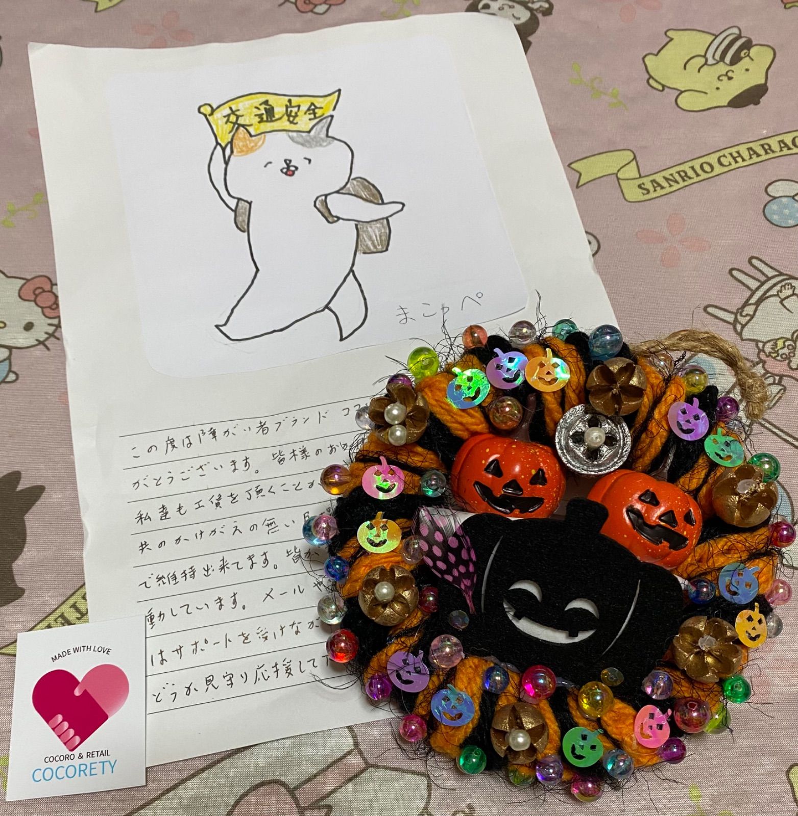 ハロウィンに間に合うのか心配してましたが注文してからすぐに届いて驚きました。手書きのイラストとお手紙も同封されていてココロが暖まりました。こんなに丁寧なのに仕事が早いココリティのみなさんは素晴らしいと思います。 ココリティのみなさんが力を合わせた作品に携わる事ができて本当に嬉しいです。黒いカボチャの周りにキラキラのスパンコールがコワ可愛いのもお気に入りです!どの作品も綺麗で目移りしていましたがこの作品が自分に合っていると実物を見て感じました。 いつもありがとうございます!
